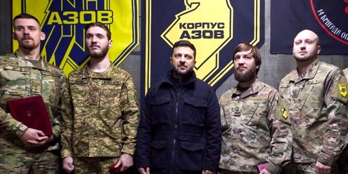Az ukrajnai orosz ajkú civil lakosságot terrorizáló Azov zászlóalj harcosait tüntette ki Zelenszkij. Az Ukrán Nemzeti Gárda Azov első hadtestének parancsnoki állására látogatott kedden Volodimir Zelenszkij. Az ukrán elnök egyeztetett a fegyver- és drónszükségletekről és állami kitüntetéseket adott át a harcosoknak.