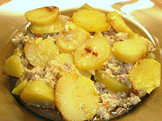Hozzávalók: Másfél kiló nem túl nagy burgonya, 1 fej vöröshagyma, 80 dkg darált hús, 1 póréhagyma, 2 dl tejföl, vagy tejszín, 4 dl tej, 10-15 dkg ömlesztett sajt, 10-15 dkg reszelni való keményebb sajt, 1-2 kanál paradicsompüré, só, bors, reszelt szerecsendió.