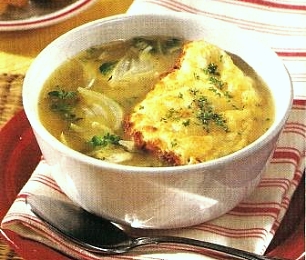 Hozzávalók: 50 dkg vöröshagyma, 2-3 gerezd fokhagyma, 4 szelet szendvicskenyér, 2 leveskocka, 10 dkg reszelt sajt, só, bors, olaj.